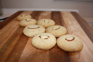 Roll dough into balls, approximately 1 inch in diameter or larger depending on the size of cookie you prefer. I like small cookies (because you get to eat more of them! Doh!) so I make mine on the shy side of 1 inch. Flatten the balls between your palms and lay on the cookie sheet. Press 1 whole almond or an almond slice into the top of each cookie.
