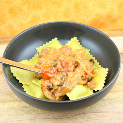 In a medium skillet on low heat, cook the onions in olive oil until translucent, about 5 minutes. Turn up the heat slightly to put just a little color on the onions, about 2 minutes. Add tempeh and tomatoes, stir to coat in oil and cook an additional 4-5 minutes until the tempeh begins to brown. Add remaining ingredients, reduce heat to low, and stir gently to melt the peanut butter and combine everything thoroughly. Cook 5 minutes more, stirring occasionally, and add more water if necessary. Serve atop brown rice, quinoa, tortillas, or, in my case, some Garlic and Roasted Veggies Ravioli from Rising Moon Organics (yep, they're vegan!).