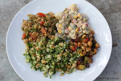 Although I didn't photograph all the foods we ate over the weekend, I did snap some shots of this quad-salad dinner we had one night when we dined al fresco in their garden. With four distinctly different salads, I had no trouble scarfing down a huge plate, even though the heat was definitely putting a damper on my appetite.