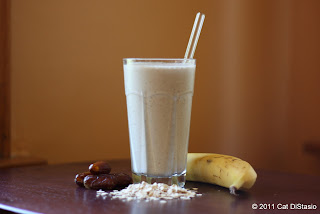 Dates and bananas are two great sweet ingredients to use when you're trying to avoid "real" sugar. Paired with almond milk and rolled oats, they whip up into a quick, easy, and totally satisfying slurry. It's so rich, I'd almost call it a milkshake. This is a great mid-morning or mid-afternoon pick-me-up, with just four simple ingredients.